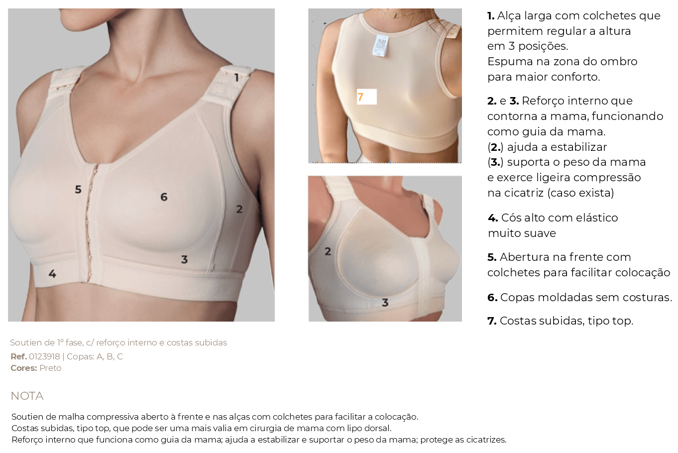 - interior da copa com estrutura almofada que circunda a mama, com múltiplas funções (guia da mama, suporte do peso, estabilizador lateral da mama e comprime e protege a cicatriz infra-mamária);